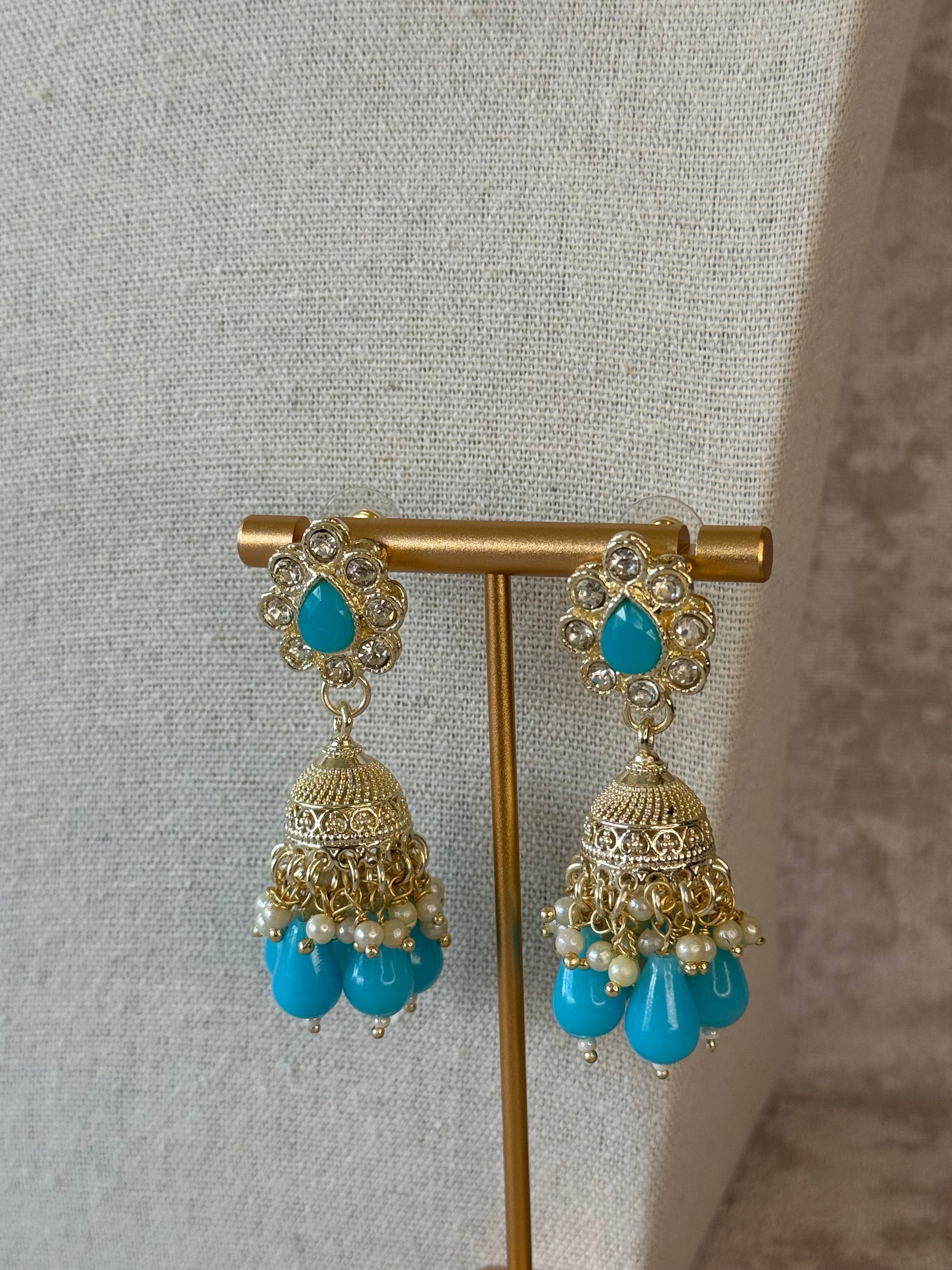 This complete Indian jewellery set features a stunning choker necklace adorned with intricate Kundan stonework and delicate beads and pearl drops, creating a captivating visual appeal.