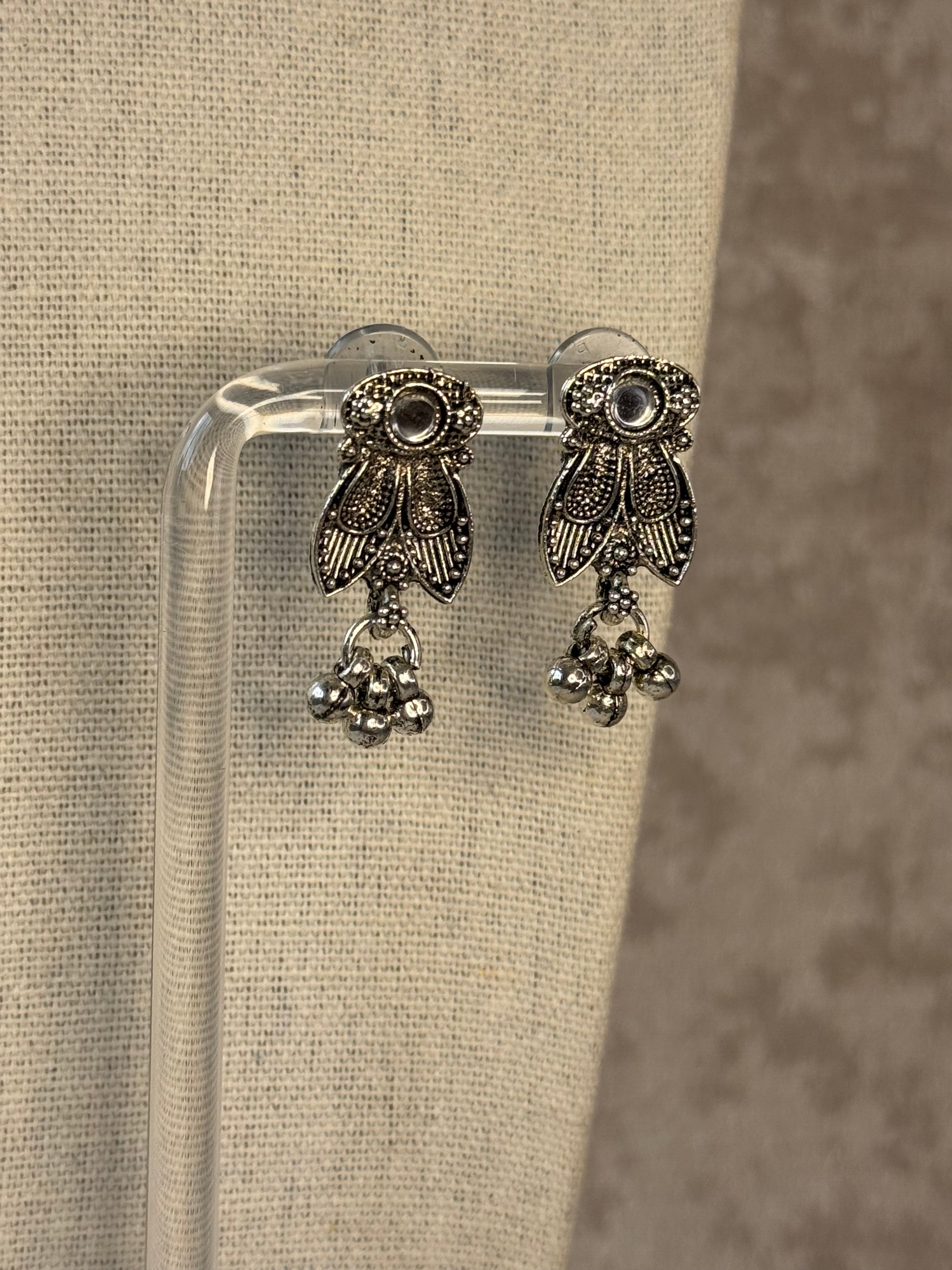 Elevate your ethnic ensemble with this stunning oxidised silver-tone jewellery set, featuring an intricately designed choker necklace and matching drop earrings.