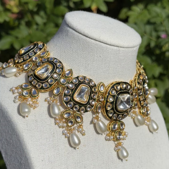 Elevate your bridal or festive look with our exquisite Deep Green Regal Kundan Set. This stunning ensemble features a choker necklace, matching pearl drop earrings, and a maang tikka.
