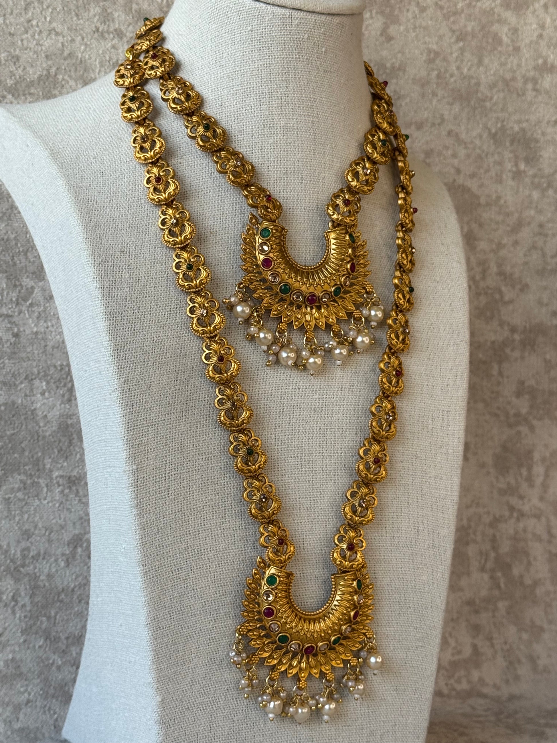 Matt Gold Long & Short necklace set with pearl & ruby green stones