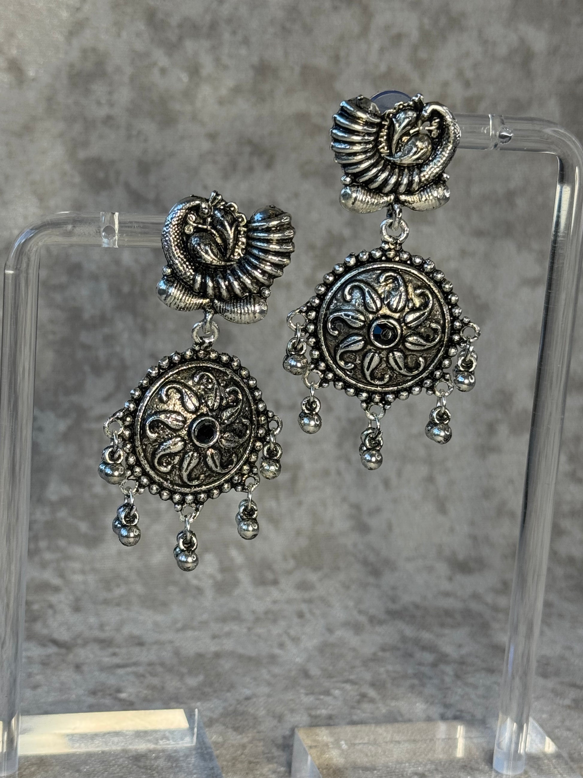 These elegant and traditional earrings feature an oxidised silver-tone finish for an antique look