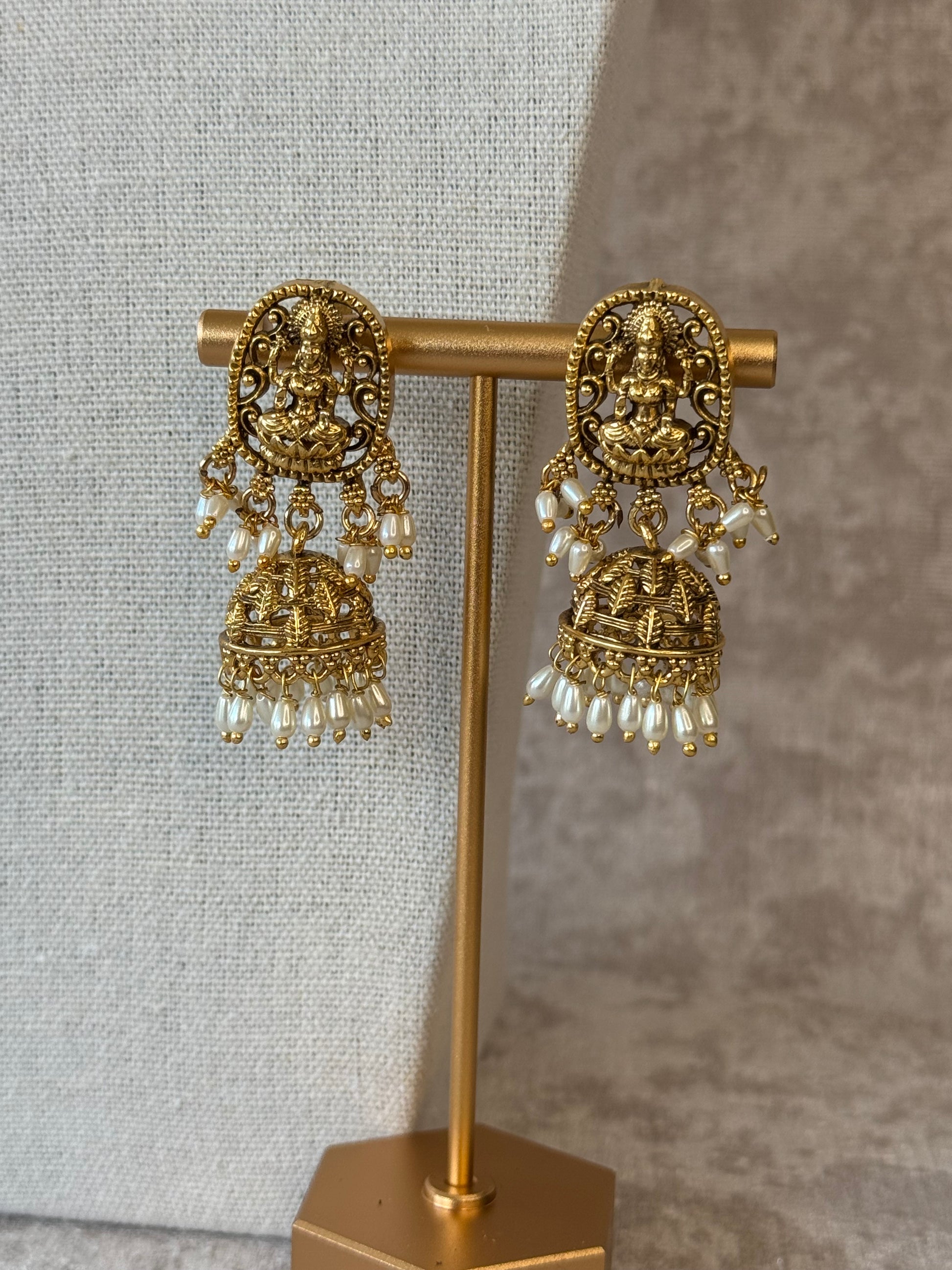 Step into tradition with this handcrafted Temple Jewellery set in a rich Rajwadi polish finish. The choker-style necklace is paired with matching jhumka drop earrings for a statement look.