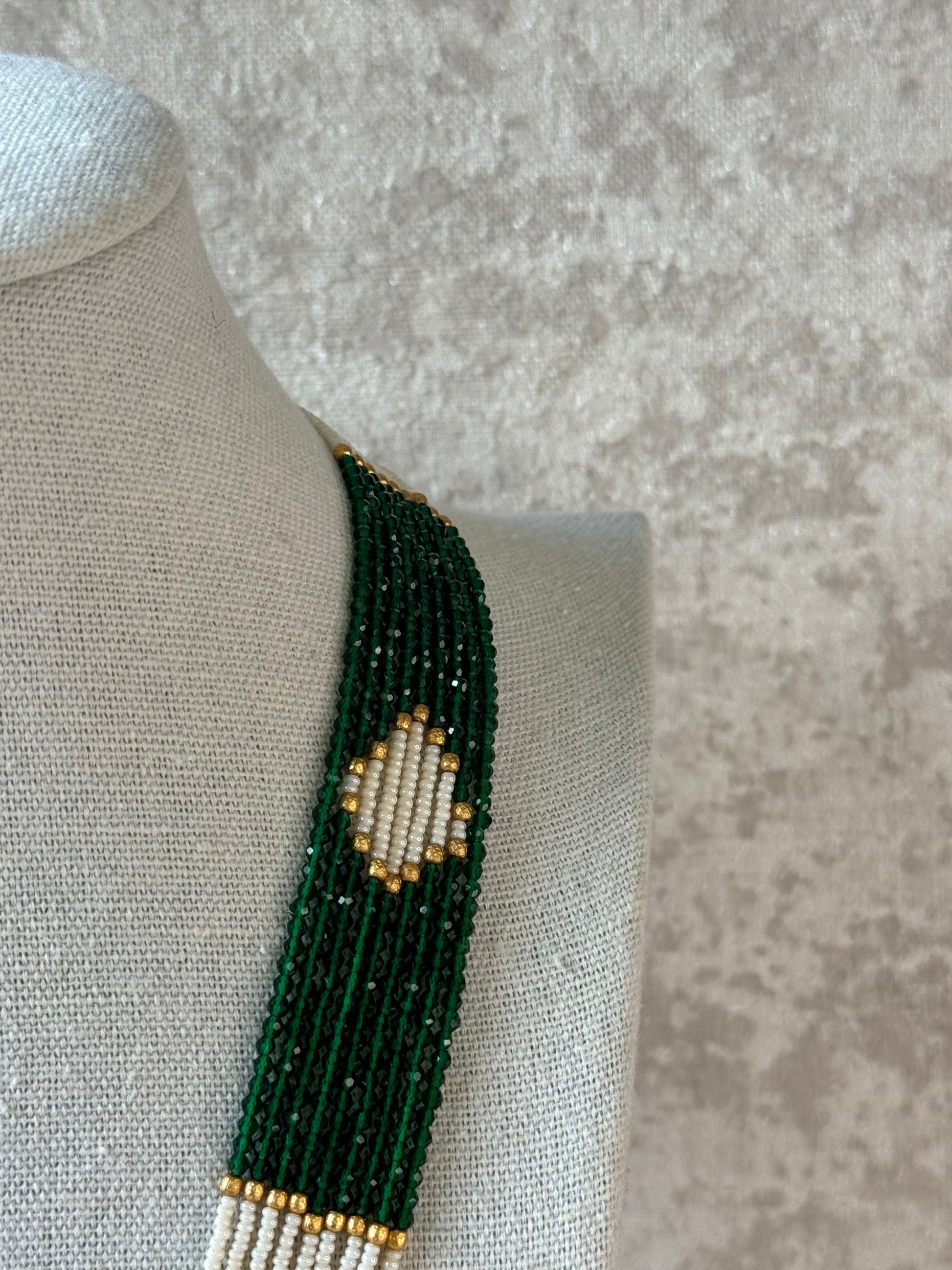 Must have timeless traditional set with handcrafted intricate detailing, rich Rajwadi polish, and green-and-white beaded chain. This set embodies the essence of heritage temple jewellery.